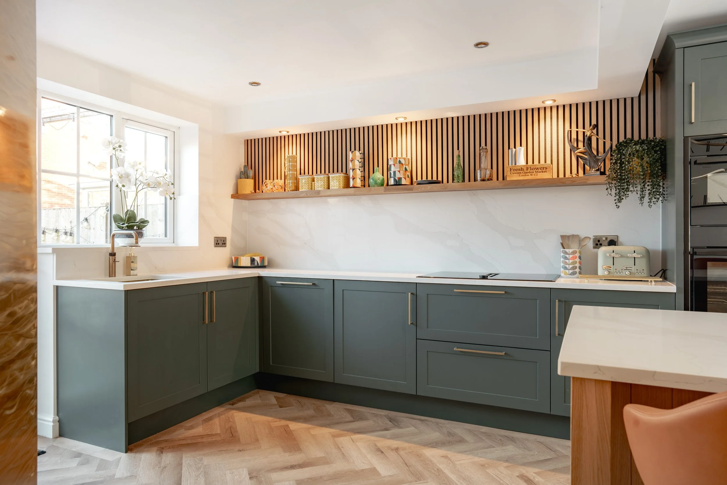 Above the hob area, we installed a bespoke oak floating shelf, infilled with Wood Veneer Hub’s Acupanel panelling—a design feature that adds depth and texture while maintaining a beautifully balanced aesthetic.