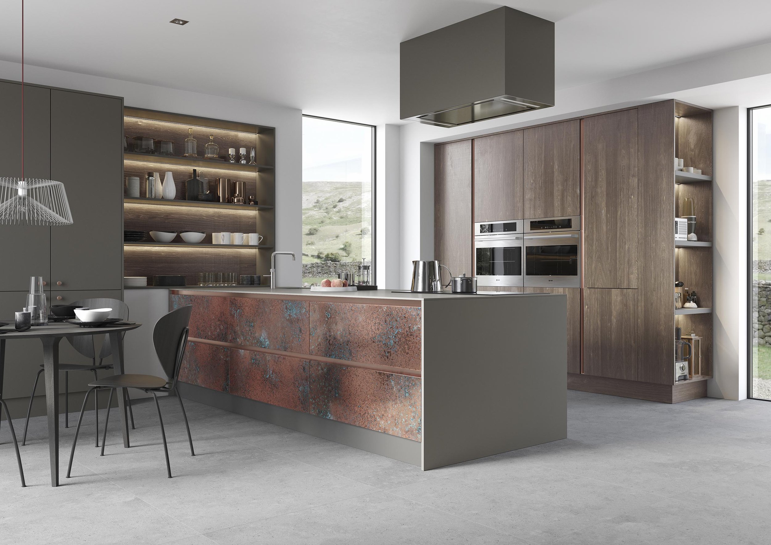 A painted metal-effect slab door crafted from MDF Plus, combining a striking metallic surface with a refined industrial aesthetic for bold, contemporary kitchen designs.